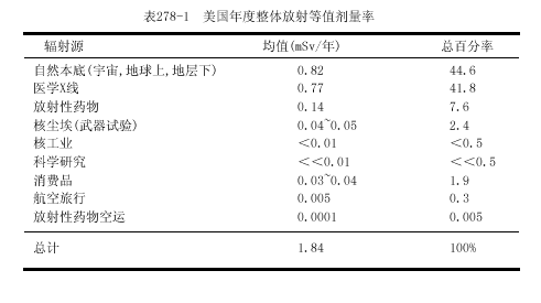 常用的測量單位是倫琴,戈瑞(Gy)和希沃特(Sv).倫琴(R)是空氣中x或γ電離輻射的計(jì)量單位,戈瑞是被各組織或物質(zhì)吸收的能量計(jì)量單位,它可應(yīng)用于各類輻射.R和厘戈瑞(cGy)基本上是相等的.在說明生物學(xué)效應(yīng)時(shí),Sv與經(jīng)質(zhì)量因子校正的Gy相等.因?yàn)閷?duì)一定量的能量而言,不同類型的輻射可產(chǎn)生不同的生物學(xué)效應(yīng);例如,中子有較大的效應(yīng).對(duì)X和γ輻射,Sv與Gy相等.在現(xiàn)代術(shù)語中Gy和Sv已替代拉德(rad)和雷姆(rem),Gy=100rad,Sv=100rem.在非專業(yè)刊物中常常將輻射分為低水平輻射(0.2~0.3Gy)和高水平輻射(>0.3Gy).而醫(yī)學(xué)劑量一般為<0.05Gy,而且常常<0.01Gy.地球及其大氣的本底放射活性水平很低,而不能測知其效應(yīng)(表278-1).